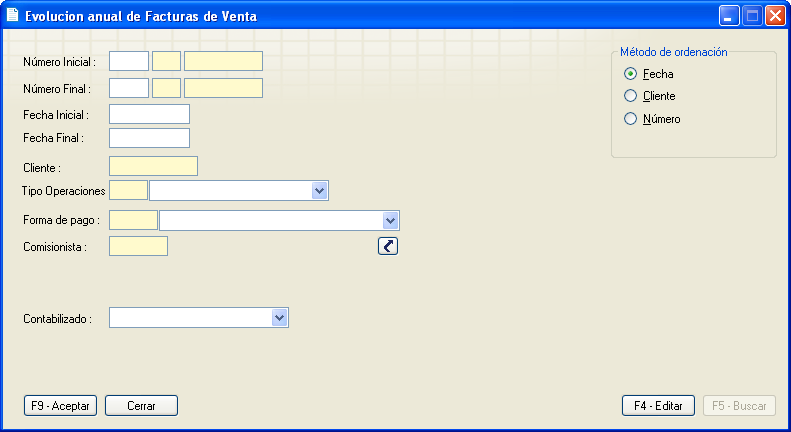 El acceso a esta opción está disponible en el menú de aplicación, "Ventas -> Facturación -> Evolución anual de facturas de venta".