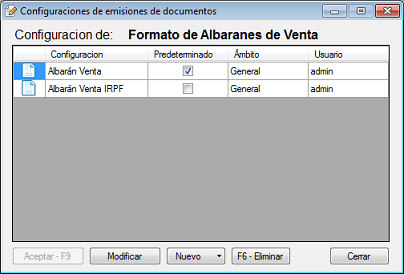 "Configuración" indica el nombre de la plantilla que utilizará el documento en las impresiones, "Predeterminado" indica si es la plantilla por defecto, "Ámbito" indica el ámbito de uso (quién podrá utilizarlo) y "Usuario" indica el usuario que la creó.