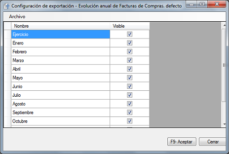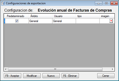 Pulsando encima del botón accederemos a la ventana de "Configuración de la exportación". En esta ventana esta disponible el formato utilizado para generar el listado, incluyendo los datos que aparecerán: